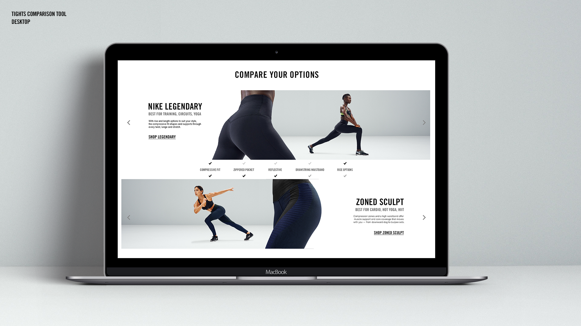 Developed the Nike Tights Finder tool to improve the digital experience of finding the right tights for you. Developed a flow and hierarchical system that would help codify and inform the user at each stage of their journey, based on preferences, and activity needs.